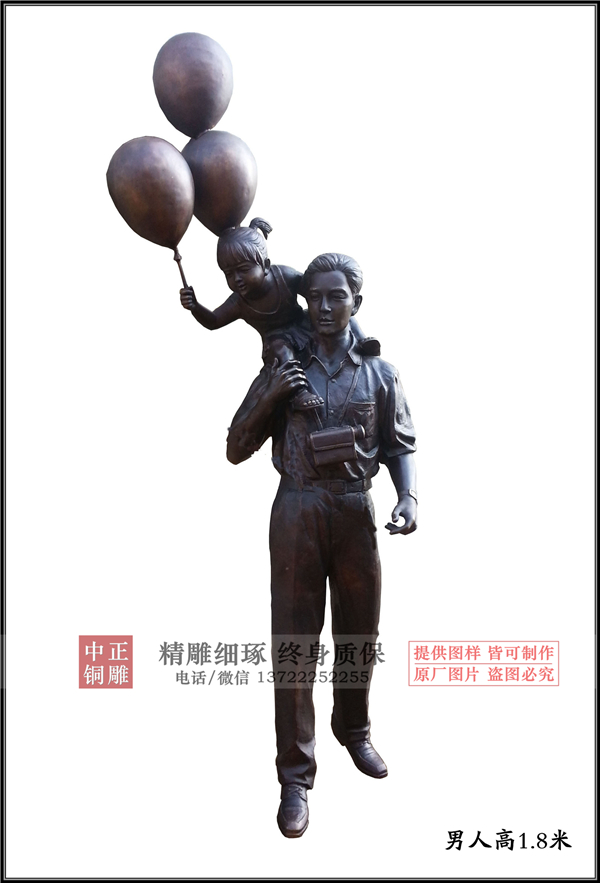 一家三口人物雕塑的創(chuàng)作來源生活,是小品雕塑的一種類型,造型中可愛的孩子手握氣球騎在爸爸肩頭,滿臉洋溢著幸福之感,母親在一旁,觀望著孩子,給人一種溫馨又似成相識的感覺,這樣的畫面在現(xiàn)實生活中隨處可見,以鑄鐵雕塑的形式呈現(xiàn)則更加形象化,更具有現(xiàn)實意義,讓人們在匆忙中禁不住停下腳步來欣賞下這溫馨的畫面。同類型的鑄鐵雕塑產(chǎn)品還有涮火鍋雕塑、洗腳雕塑等,都是現(xiàn)代雕塑系列中親情與愛的表現(xiàn)形式。