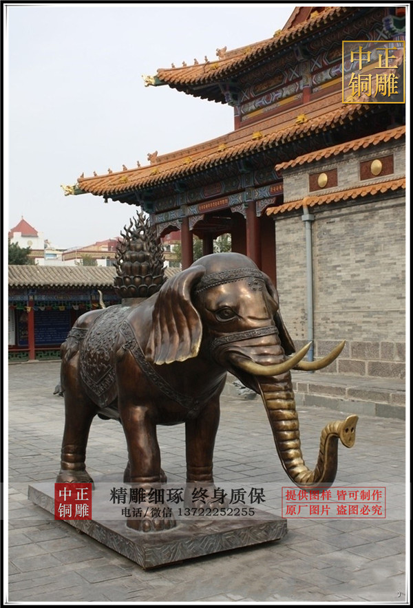 銅大象在印度、泰國稱為“象神”,大象的鼻子可吸水象征可把外面的財吸進(jìn)來,銅大象擺放在公司門口或家里都有招財作用,其中背馱金蟾的大象謂之“向上發(fā)財”。因?yàn)槿f象更新的“象”,諧音“祥”、和“相”,古人云:“太平有象”,寓意“吉祥如意”。