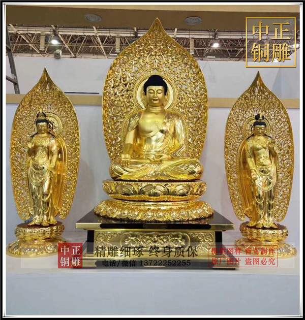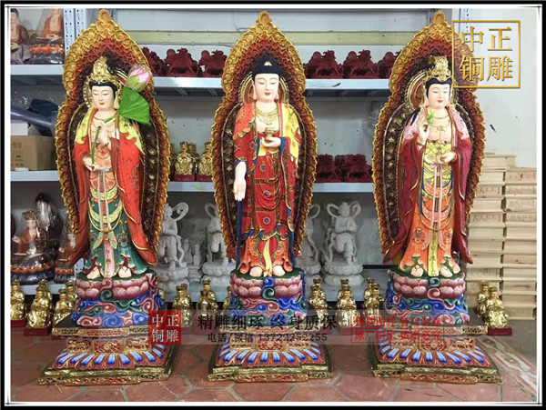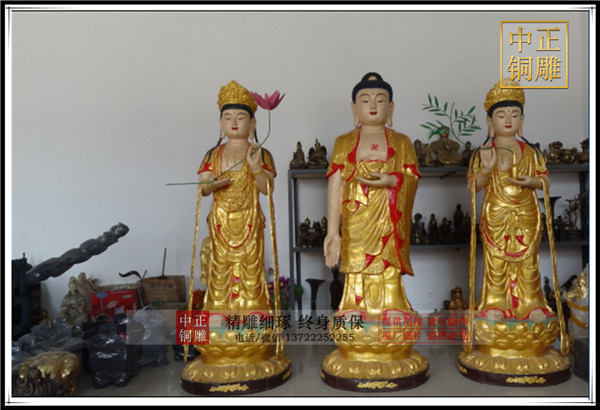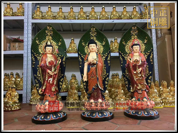 在佛教中佛像的塑像有很多,很多人看到這么多的塑像,就誤認(rèn)為佛教是泛神教,而其它宗教都是一個教主,唯一的教主,一人說了算,就在佛教這比較亂。其實(shí)是因?yàn)樗麄儾恢婪鸾坦B(yǎng)佛像的意思,諸佛像不是代表神,而是代表了法門的。世間有無量無邊的事和理,用一種方法很難完全表達(dá),所以銅雕佛像廠家才會塑造許許多多不同的佛像方便表法。我們今天就來說說西方三圣銅像。