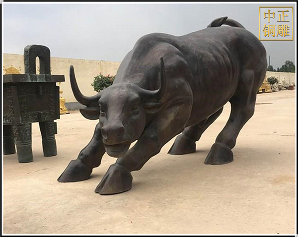 美國(guó)華爾街紐約證券交易所門(mén)前便有一只“旺市銅?!?是重金邀請(qǐng)著名塑大師及鑄造大家以5噸青銅精心澆鑄而成。此牛形體健壯,磅礴,人們以此牛來(lái)喻意證券行情的“牛市”發(fā)展,也是人們看好“牛市”的一種心理意識(shí),表達(dá)對(duì)證券、全球金融、貿(mào)易、工商人士的祝福,希望他們牛氣相隨、事業(yè)發(fā)達(dá),如今被更多人引伸為“幸運(yùn)牛”。