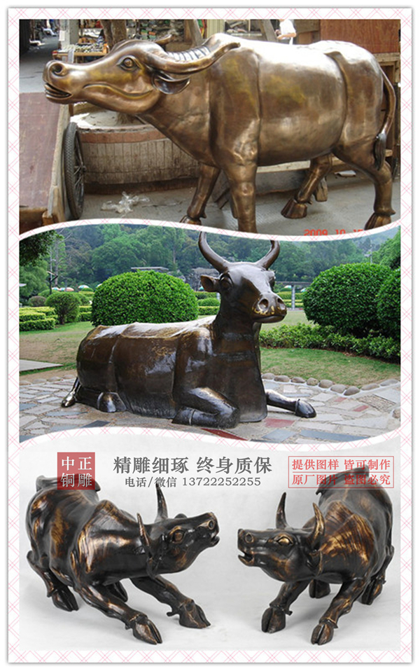 牛推動(dòng)了農(nóng)耕時(shí)代的社會(huì)發(fā)展。那個(gè)農(nóng)耕時(shí)代,牛的辛勤付出,生產(chǎn)了豐富的五谷雜糧,養(yǎng)育著從事百業(yè)生產(chǎn)勞作的勞動(dòng)人民,養(yǎng)育著整個(gè)人類社會(huì)。盡管耕牛已經(jīng)退出了農(nóng)業(yè)生產(chǎn)第一線,退出了歷史舞臺(tái),但農(nóng)耕精神和耕牛的任勞任怨卻成為人們永遠(yuǎn)的精神財(cái)富,永遠(yuǎn)激勵(lì)人們勇敢地去拼搏進(jìn)取,開(kāi)創(chuàng)美好的生活,開(kāi)創(chuàng)美麗的未來(lái)。中正銅雕-廠家直銷銅牛雕塑,加工廠家直銷銅牛雕塑,定做廠家直銷銅牛雕塑,我司愿與天下有識(shí)之士,真誠(chéng)相待、真情相融,共謀進(jìn)取、共創(chuàng)輝煌!以優(yōu)質(zhì)的工藝和設(shè)備與科學(xué)規(guī)范的管理相結(jié)合是我們中正銅雕塑質(zhì)量創(chuàng)造工藝名牌的基礎(chǔ)。