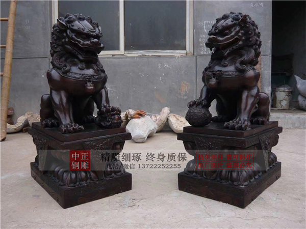 銅獅子也有等級(jí)之分。七品以上官門口才允許設(shè)銅獅子,而銅獅子的等級(jí),便是由它們滿頭的“卷發(fā)”來(lái)判斷的。一品官員門口的銅獅子,頭上有十三個(gè)“卷發(fā)”,也被稱為“十三太?!保饭賳T門口的銅獅子,頭上便減少一個(gè)“卷”,以此類推,官員等級(jí)每向下降一級(jí),獅子頭上的“卷發(fā)”便少一個(gè)??上攵蕦m門口的銅獅子,頭上的“卷發(fā)”是最多,有45個(gè),這自然是象征著皇帝“九五之尊”不可動(dòng)搖的地位。中正銅雕-故宮獅子現(xiàn)貨,大型故宮獅子現(xiàn)貨,定做故宮獅子現(xiàn)貨,我廠是一家以設(shè)計(jì)、制作、安裝為一體的發(fā)展型企業(yè)。公司坐落在中國(guó)銅雕之鄉(xiāng)---河北唐縣,成立于1984年。公司自成立以來(lái),以優(yōu)質(zhì)的雕塑工藝,優(yōu)異的性價(jià)比,一體化的銷售網(wǎng)絡(luò),高效、完善的售后服務(wù),飛速發(fā)展。成為了擁有設(shè)計(jì)、銷售、生產(chǎn)、安裝、維護(hù)為一體的銅雕塑制作商。