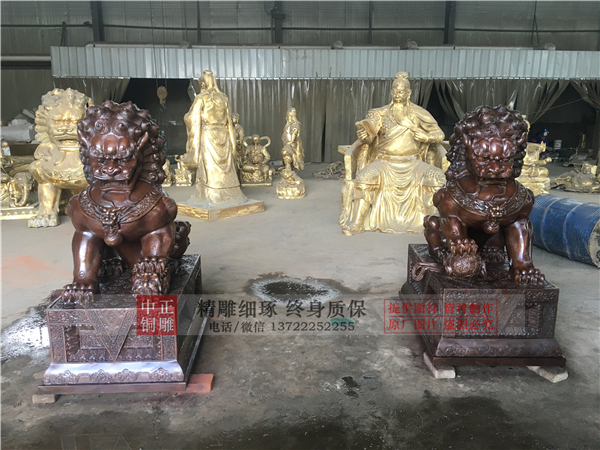 獅子:瑞獸一種,百獸之王,勇不可擋,威震四方,不但可以避邪,且可帶來祥瑞之氣,能解除多種形煞,亦加強(qiáng)官威或屋主之陽氣,如果窗口見到不利之沖克,可放一對石獅面向口可化煞,且有生權(quán)之意。凡是以口維生之行業(yè),如律師、藝員等,可在辦公室內(nèi)擺放一對聲威,有助于生財。中正銅雕-故宮銅獅子,故宮銅獅子雕塑,大型故宮銅獅子,我公司實行現(xiàn)代化企業(yè)管理,成功導(dǎo)入TPS生產(chǎn)管理系統(tǒng),形成集塑制泥塑模型、泥稿后翻制模具、翻制石膏模型、工藝師加工制作、營銷為一體化作業(yè)的生產(chǎn)線,加上先進(jìn)的銅雕加工設(shè)備,優(yōu)秀的美術(shù)設(shè)計師,雕刻經(jīng)驗豐富的制作人員, 造型精美,精雕細(xì)琢,深受客戶的好評。
